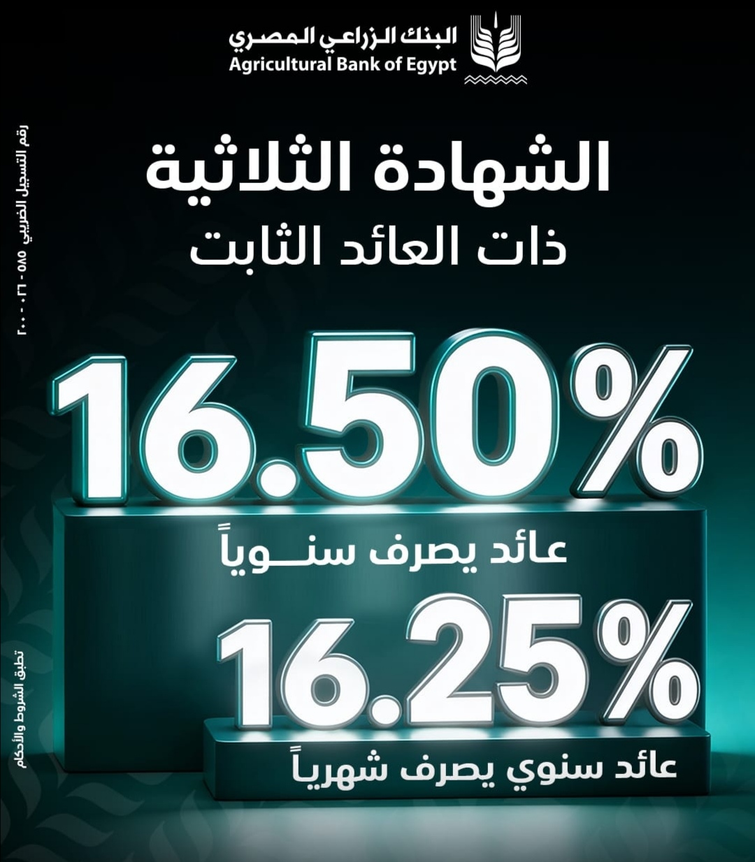 ويأتي إطلاق الشهادة الثلاثية في إطار حرص البنك الزراعي المصري على تطوير منتجات مصرفية متنوعة تلبي احتياجات مختلف فئات العملاء، سواء من الأفراد أو المزارعين أو أصحاب المشروعات الصغيرة، إلى جانب تعزيز مكانته كأحد البنوك الرائدة في تقديم حلول مالية وادخارية موثوقة تدعم خطط العملاء في إدارة وتنمية مدخراتهم.